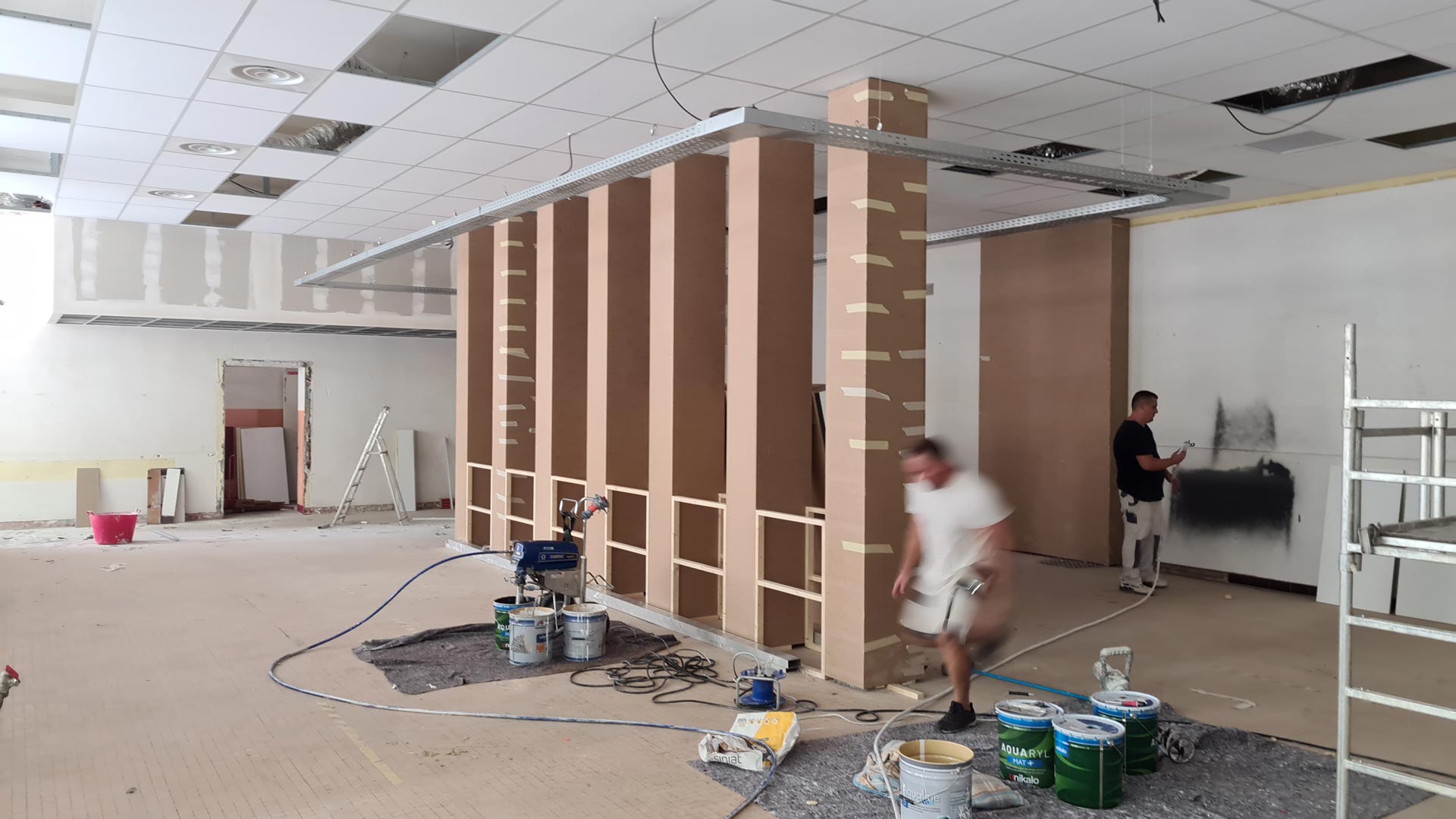 Les photos ci-dessus représentent la fin des deux premières semaines. Plafond, placages, peinture, habillement et sols, nous avancions sereinement (à ne pas confondre avec tranquillement !) dans la bonne humeur. Nous étions dans les temps pour passer aux finitions. De concert avec le menuisier, le projet prenait forme sous nos yeux et c’est vrai que ça avait de la gueule. Ça nous rappelait notre scolarité et la froideur de nos réfectoires. On salue, ici, l’école Jeanne d’Arc qui a eu le bon goût d’accepter ce concept de cantine en pensant au bien-être des élèves.